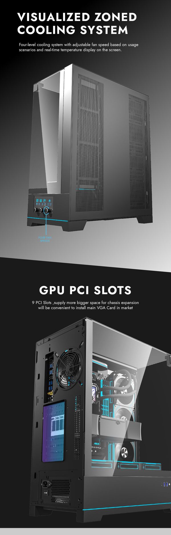 Four-level cooling system with adjustable fan speed and real-time temperature display.